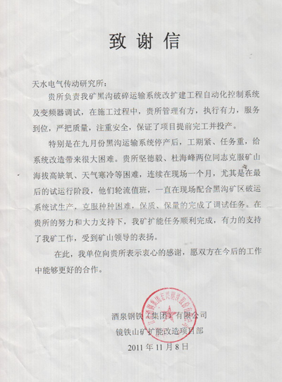 感謝信指出,在項(xiàng)目調(diào)試安裝過(guò)程中,天傳所公司管理有方、執(zhí)行有力、服務(wù)到位,保證了項(xiàng)目提前完工并順利投產(chǎn),公司兩名員工更是克服惡劣的自然條件,連續(xù)奮戰(zhàn)一個(gè)多月,保質(zhì)保量的完成了調(diào)試任務(wù)。酒泉鋼鐵(集團(tuán))充分肯定了天傳所公司良好的精神面貌和扎實(shí)的工作作風(fēng),對(duì)調(diào)試員工付出的努力表示衷心的感謝,并希望在今后的工作中,再接再厲,為酒鋼提供更多的優(yōu)質(zhì)技術(shù)服務(wù)。