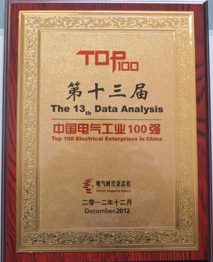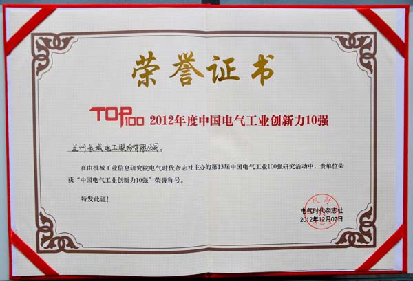 2012年12月7日,2012年12月7日,在由中國(guó)機(jī)械工業(yè)聯(lián)合會(huì)主管,國(guó)內(nèi)具有重要影響的機(jī)械工業(yè)信息研究院主辦《電氣時(shí)代》雜志社舉辦的“第九屆中國(guó)電氣工業(yè)發(fā)展高峰論壇暨第13屆中國(guó)電氣工業(yè)100強(qiáng)研究發(fā)布會(huì)”頒獎(jiǎng)大會(huì)上,蘭州長(zhǎng)城電工股份有限公司榮獲“第十二屆中國(guó)電氣工業(yè)100強(qiáng)”(2011年度)和“中國(guó)電氣工業(yè)創(chuàng)新力10強(qiáng)”榮譽(yù)稱號(hào),位列中國(guó)電氣工業(yè)100強(qiáng)第54位,并被評(píng)選表彰為中國(guó)電氣工業(yè)創(chuàng)新力10強(qiáng),這已是長(zhǎng)城電工連續(xù)五次入選中國(guó)電氣工業(yè)100強(qiáng)。