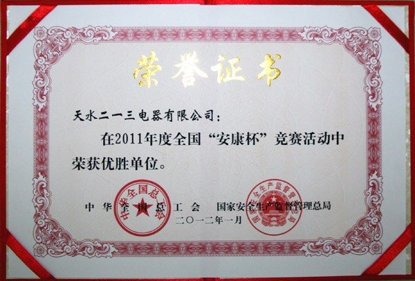 2011年度,中華全國(guó)總工會(huì)和國(guó)家安全生產(chǎn)監(jiān)督管理總局在全國(guó)企事業(yè)單位開(kāi)展了以“抓班組,提高管理水平;重教育,推進(jìn)安全文化”為主題的“安康杯”競(jìng)賽活動(dòng)。長(zhǎng)城電工天水二一三電器有限公司在這次活動(dòng)中,表現(xiàn)優(yōu)異,榮獲優(yōu)勝單位稱(chēng)號(hào)。