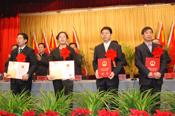 長(zhǎng)開(kāi)廠公司技術(shù)中心有關(guān)負(fù)責(zé)人和獲獎(jiǎng)成果研發(fā)人員(左一、左二)代表參加表彰大會(huì)并上臺(tái)領(lǐng)獎(jiǎng)。