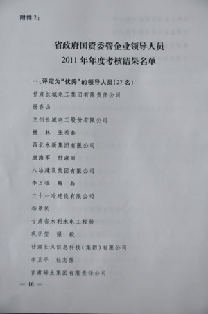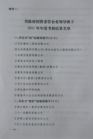 4月17日,省政府國資委黨委下發(fā)《關(guān)于省政府國資委管企業(yè)領(lǐng)導(dǎo)班子和領(lǐng)導(dǎo)人員2011年年度考核情況的通報》(甘國資黨發(fā)[2012]65號),對省政府國資委管企業(yè)領(lǐng)導(dǎo)班子和領(lǐng)導(dǎo)人員2011年年度考核結(jié)果進行了通報。